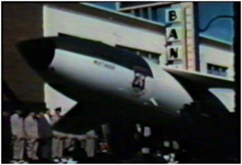In Tactical Air Command Captain Davis was first stationed at Seymour Johnson and Shaw AFB serving with the 9th Air Force 4411th and 4415th Combat Crew’s flying the reconnaissance RB-66. Later, Cecil transferred to Tactical (nuclear) Missile Wing, Florida. At the 4504th Missile Training Wing he was Information Officer, on the Command Staff overseeing missile launches from Cape Canaveral, and supervised the education and Public Relations of tactical missiles to the public. Photo below L to R: Cecil Davis with Airman Monte Blue at Cape Canaveral. Note: writing on missile nose reads 4504th MSL TRG WG (TAC). And, Matador missile on parade with Wing at Orlando AFB |