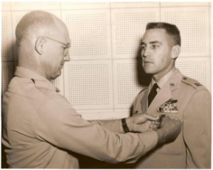 Awards and Decorations: Distinguished Flying Cross, Air Medal with Oak Leaf Cluster, U.S. Presidential Unit Citation*, U.S. Army Good Conduct Medal, American Campaign Medal**, Asiatic Pacific Campaign Medal with two Battle Stars, Victory Medal World War II, World War II Occupation Medal, National Defense Service Medal with Battle Star, Korean Service Medal with two Battle Stars***, Korean Defense Service Medal, Air Force Longevity Service Ribbon with four Oak Leafs, Armed Forces Reserve Medal with Bronze Hour Glass, Air Force Small Arms Expert Ribbon, Republic Of Korea Presidential Unit Citation, United Nations Korean Service Medal, Republic Of Korea (ROK) Korean War Service Medal, and Ambassador for Peace Medal (ROK). * Some documents awarded an Oak Leaf cluster, **some a Battle Star, ***some five Battle Stars, and the Air Force Commendation Medal (on retirement).