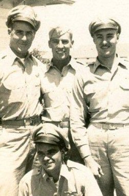 Photo Shown Right - Standing: 2nd Lt Elmer Anderson, Nav; 2nd Lt Cecil Davis, Pilot; and 2nd Lt Hollis Logan, Radar. Kneeling: 1st Lt Richard G. Brinck, AC - just prior to departing Davis Monthan Army Air Field.