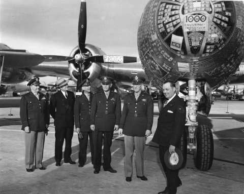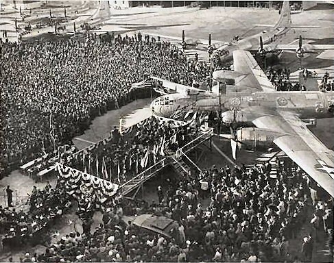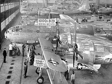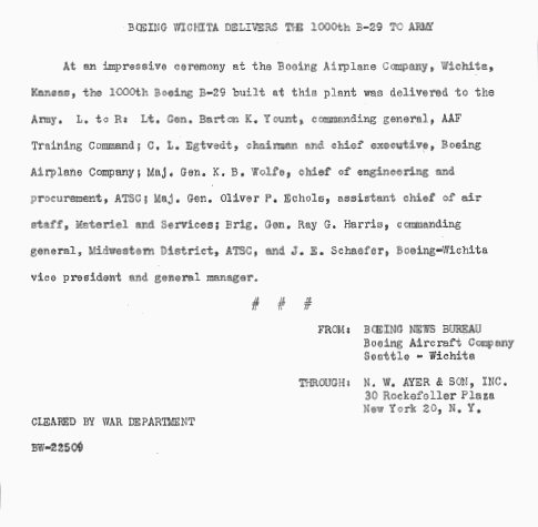 | Favored by warm breezes and under a blue Kansas Sky, a vast crowd attends the delivery ceremony on the Boeing-Wichita flight apron at 4:15 P.M., 2/14/1945 |