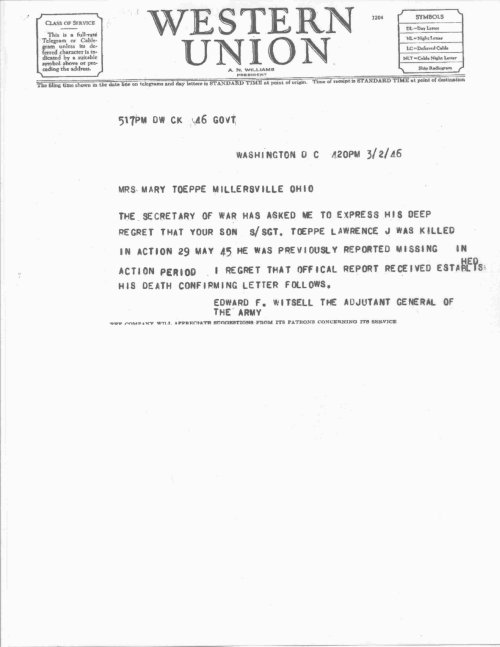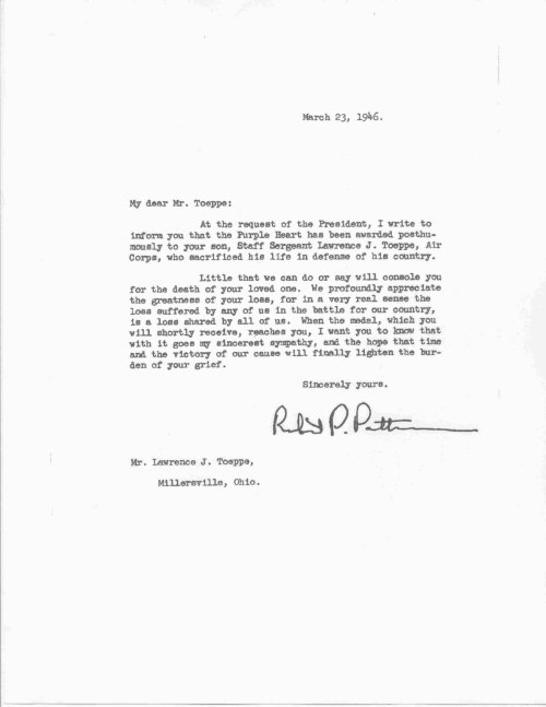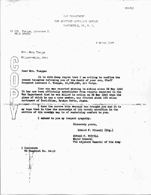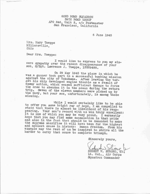 The following documents are courtesy of S/Sgt Lawrence Toeppe's brother Kenneth. Click on each image to enlarge