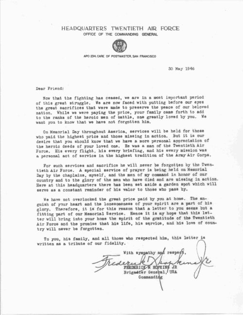War Dept Letter notifying KIA