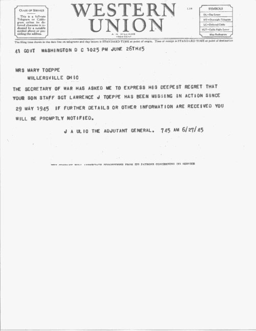 Telegram notifying MIA Status