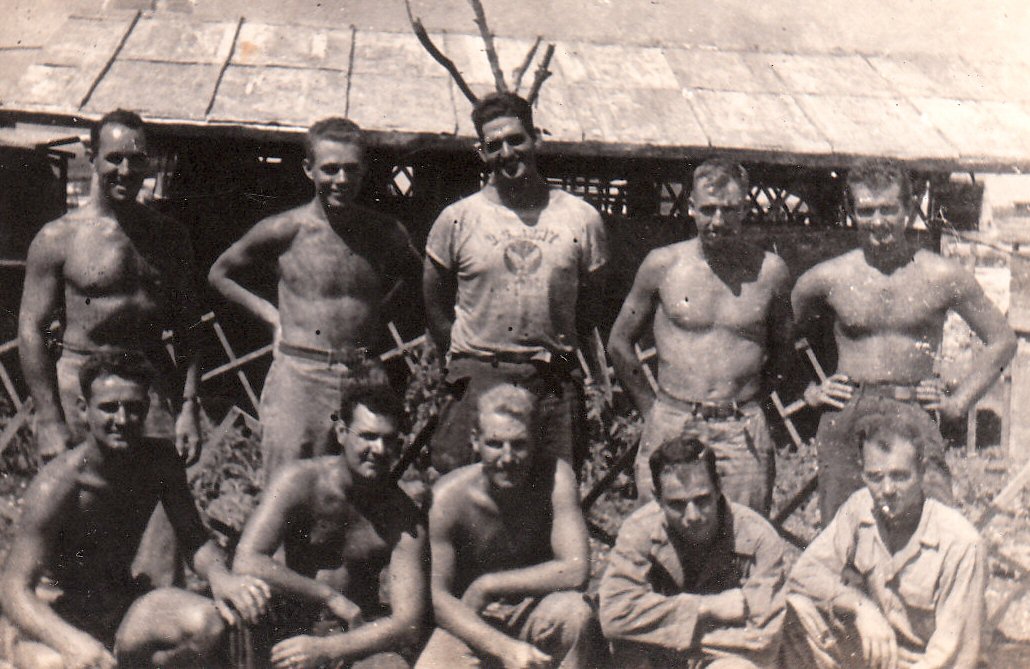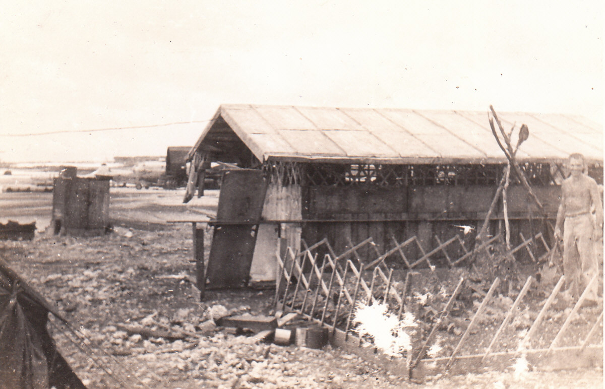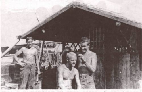 a haircut from S/Sgt Joseph H. Feldhake in front of the Electrical