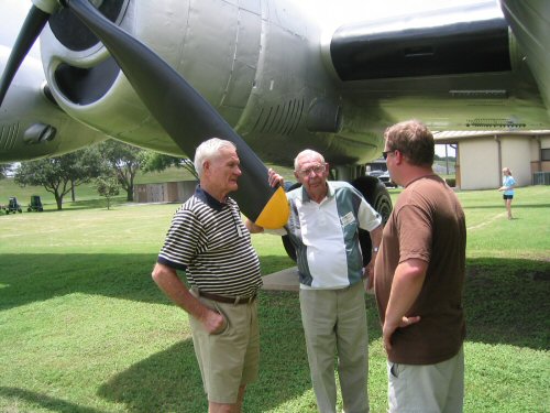 Radio Operators: David Fisher (P-55) (L) and Jim Schwoegler (P-30) share experiences with Jim Rudolph, Jim Schwoegler's grandson. |