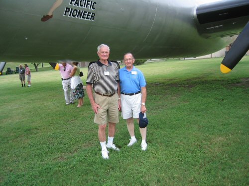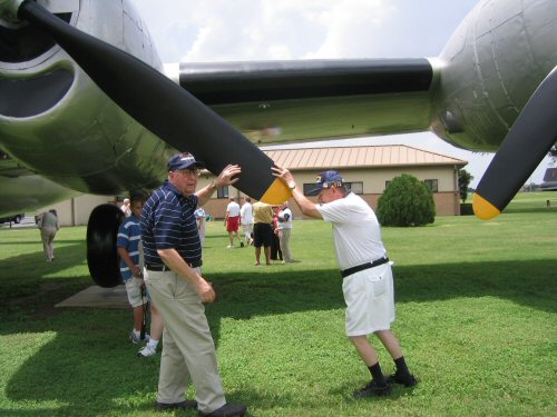 Marvin Demanzuk, Radar, P-2 (L) and Vic Durrance, (TG, P-21) showing how they used to "pull the props" on each engine prior to start up before each mission.