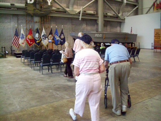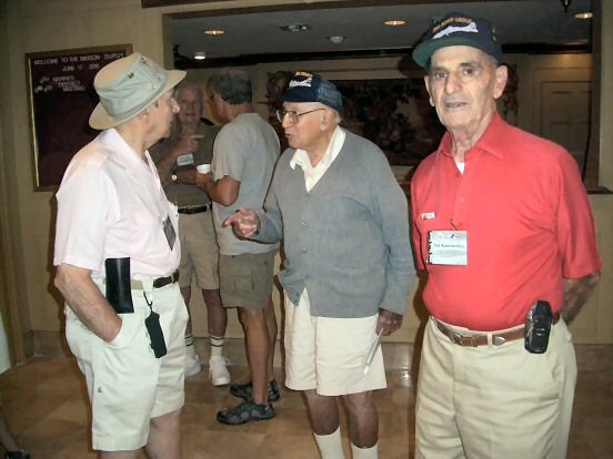 Norm Brug, Mech, P-31; Bernie Greene, Bombardier, P-31; Ted Kalenterindes, FE, P-49; (and in the background David Fisher, Radio Op, P-55) (in green shirt) awaiting the bus to the National WWII Museum