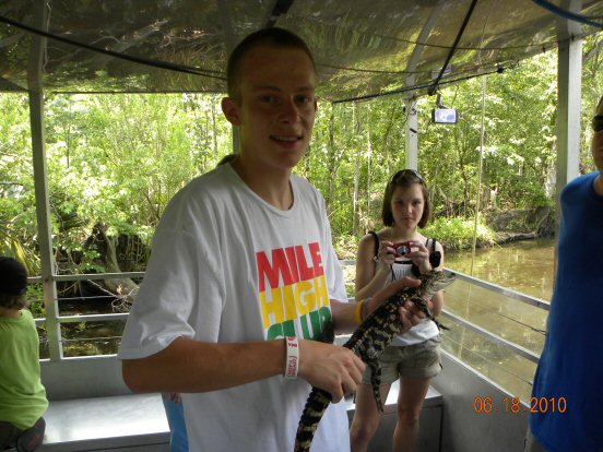 Kyle Wise holding a baby alligator while his cousin Michael looks on ...