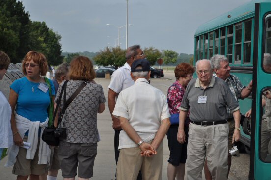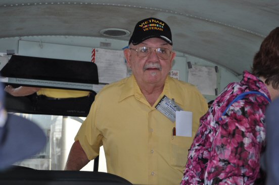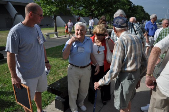 Gloria Bein, (Bernie's sister), Norm Brug, Mech, P-31; Bernie Greene, Bombardier, P-31 awaiting the bus to the USAF Museum |