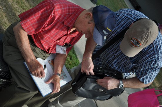 Norm Brug giving an autograph to a fellow visitor of the museum |